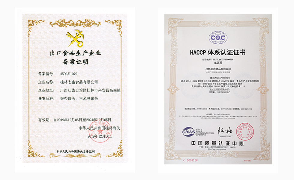 桂林宏鑫食品有限公司,從2002年開始,專注于銀杏罐頭、白果罐頭、真空包裝白果仁等產(chǎn)品的加工和出口。公司通過出口食品生產(chǎn)企業(yè)備案,獲得HACCP體系認(rèn)證,具備進(jìn)口貿(mào)易資質(zhì)。